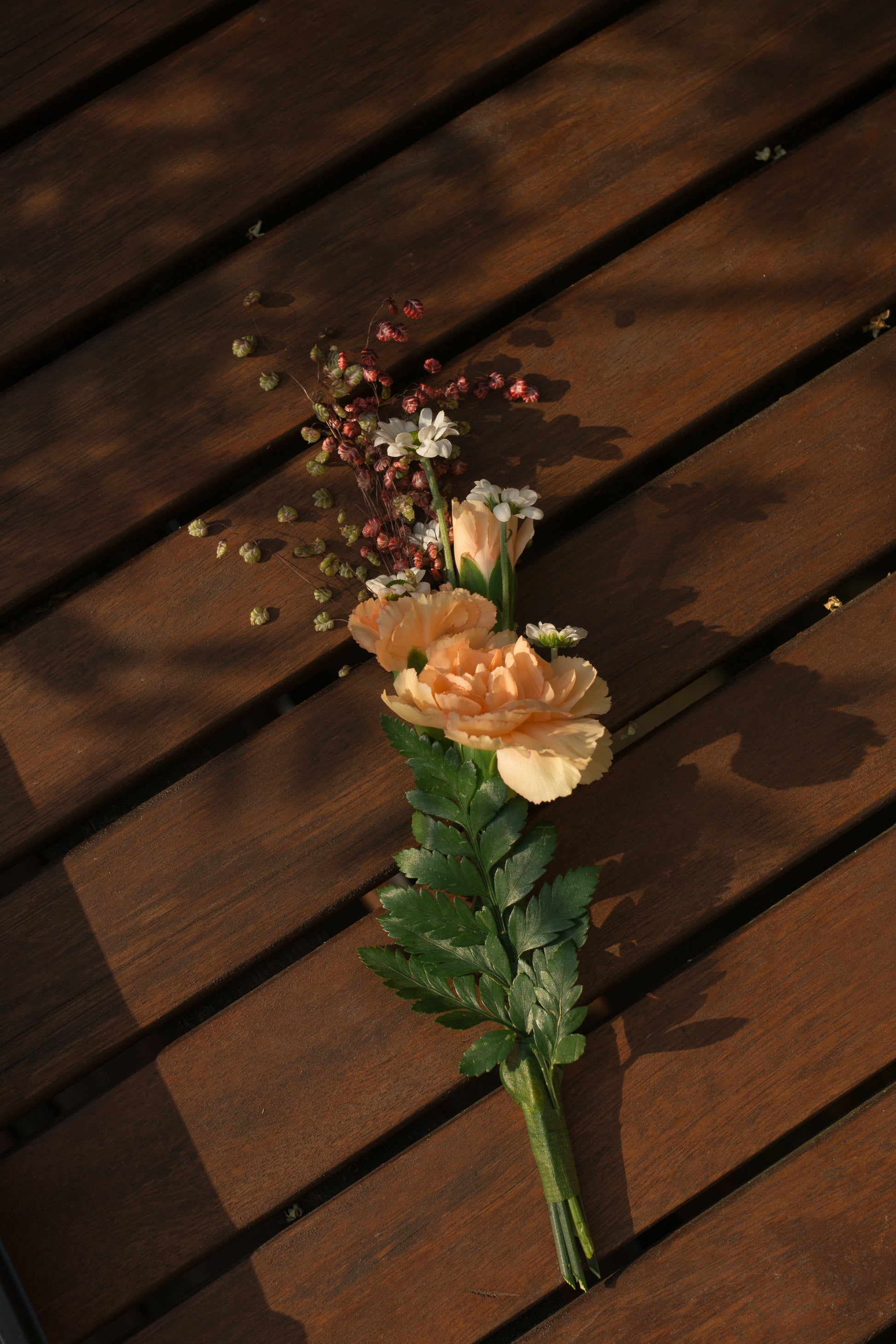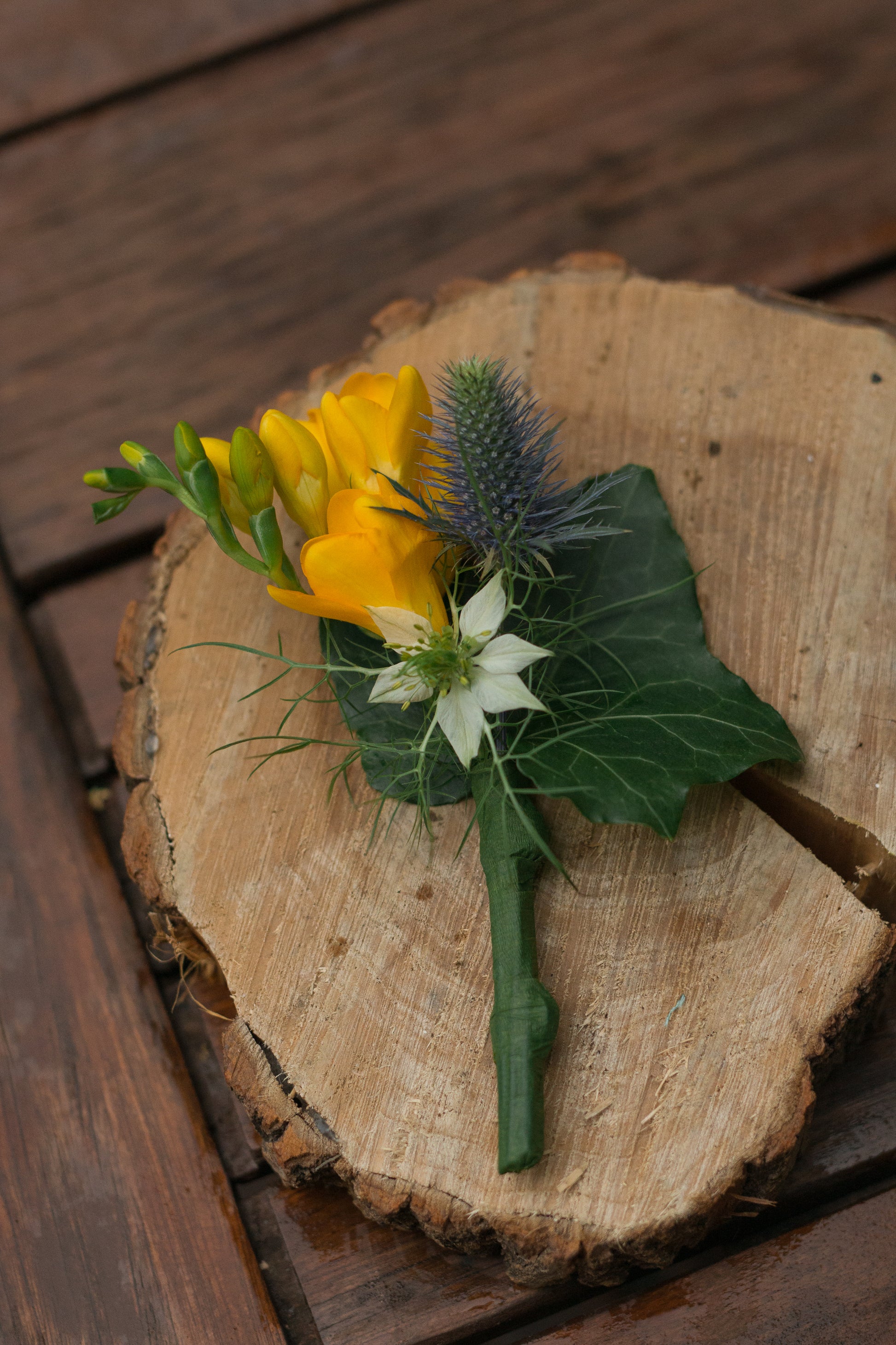 Butonierki kwiatowe z delikatnym przybraniem dla Pana Młodego i Ojców Pary Młodej.