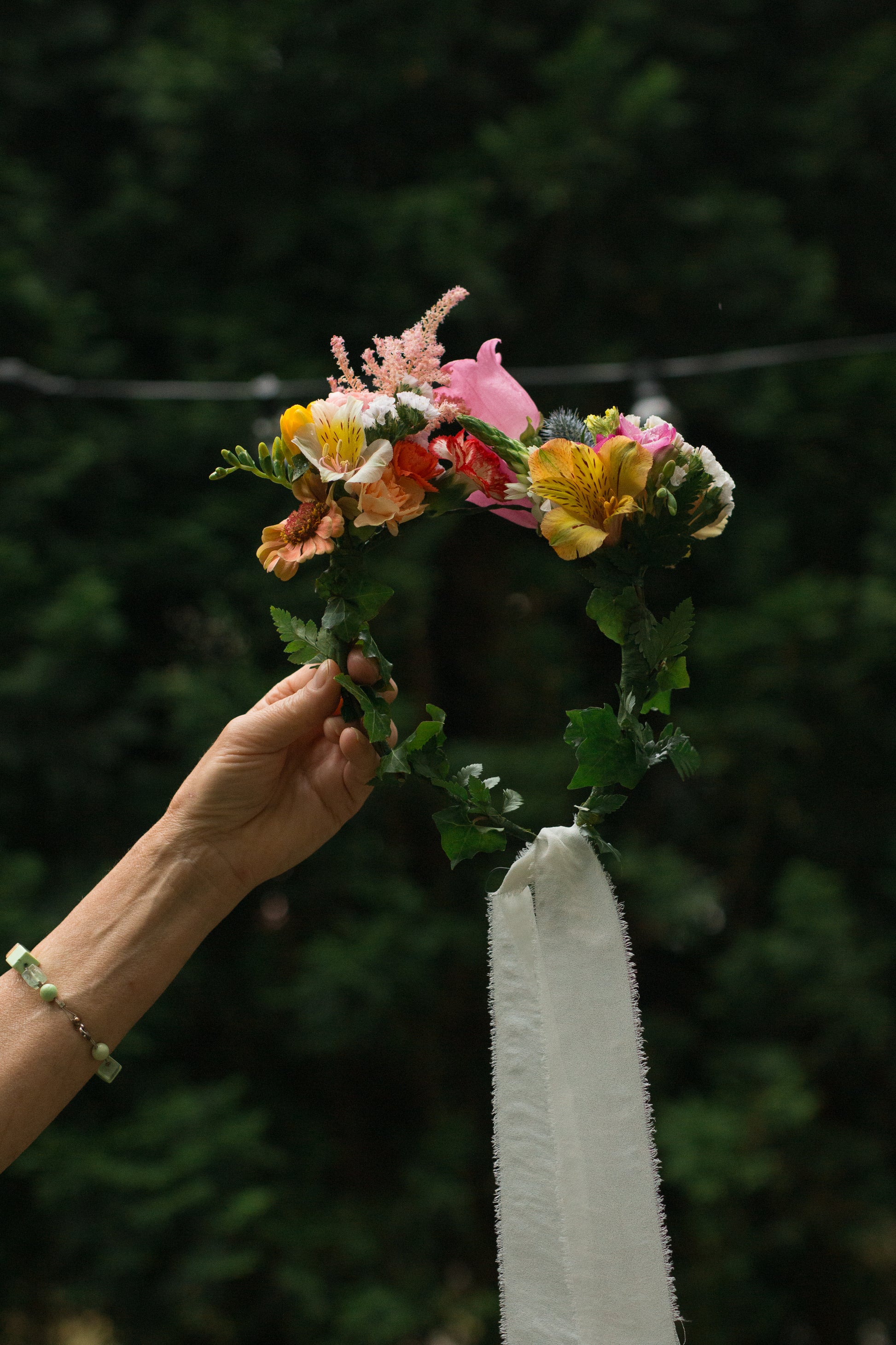 Wianek w kształcie niskiej korony na górze z różnokolorowych kwiatów ogrodowych/polnych długością 20 cm, po bokach i z tyłu zielone listki/gałązki, zawiązany szyfonową wstążką